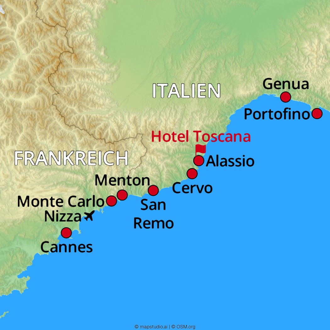 Erleben Sie die Faszination der Côte d’Azur und der Blumenriviera bei einer Reise voller mediterraner Lebensfreude, kultureller Schätze und kulinarischer Genüsse. Ihr komfortables 4-Sterne Hotel liegt nur wenige Schritte vom Strand und der charmanten Altstadt von Alassio entfernt – perfekt, um das italienische Dolce Vita hautnah zu genießen. Entdecken Sie die mondänen Städte Monte Carlo, Nizza und Cannes, schlendern Sie durch malerische Gassen in Cervo oder Dolceacqua und lassen Sie sich von der Schönheit der ligurischen Küste verzaubern. Bei Ausflügen mit Weinprobe, Pasta-Mittagessen und spannenden Stadtführungen erleben Sie die Region mit allen Sinnen. Diese Reise verbindet Erholung am Meer mit eindrucksvollen Erlebnissen – eine perfekte Mischung für unvergessliche Urlaubstage.