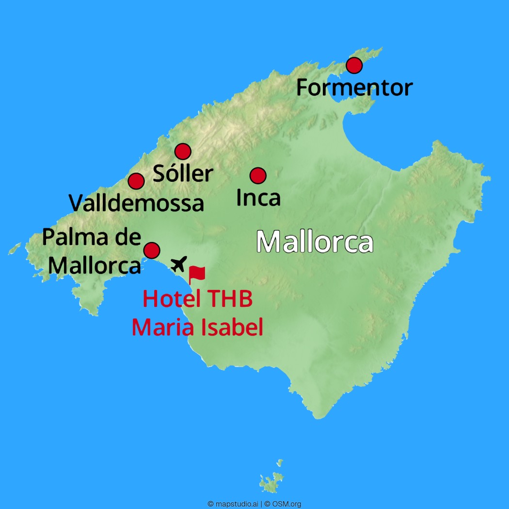 Lage: Das Hotel THB María Isabel liegt an der Playa de Palma, nur 4 km vom Flughafen von Mallorca entfernt.