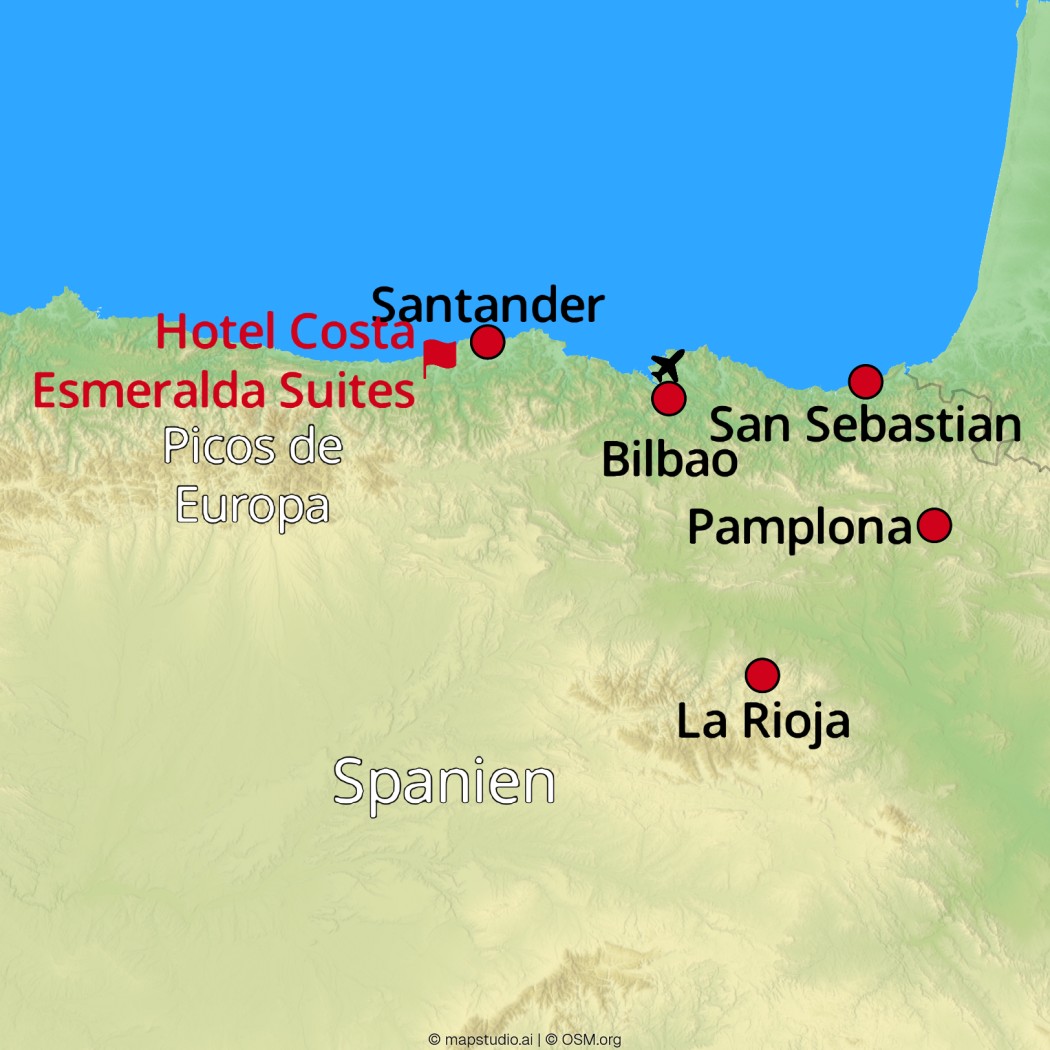 Flug von Deutschland nach Bilbao. Empfang durch Ihre Deutsch sprechende Reiseleitung und Transfer zu Ihrem Hotel in Suances. Beim Empfangsgetränk erhalten Sie wichtige Informationen zu Land und Leuten. Abendessen und Übernachtung im Hotel.