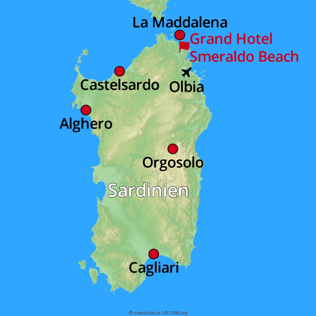 Lage: Das klassische Badehotel Grand Smeraldo Beach ist im sardischen Stil erbaut und liegt direkt am hoteleigenen Sandstrand. Das Zentrum des kleinen, charmanten Urlaubs-ortes Baja Sardinia ist ca. 250 m entfernt.
